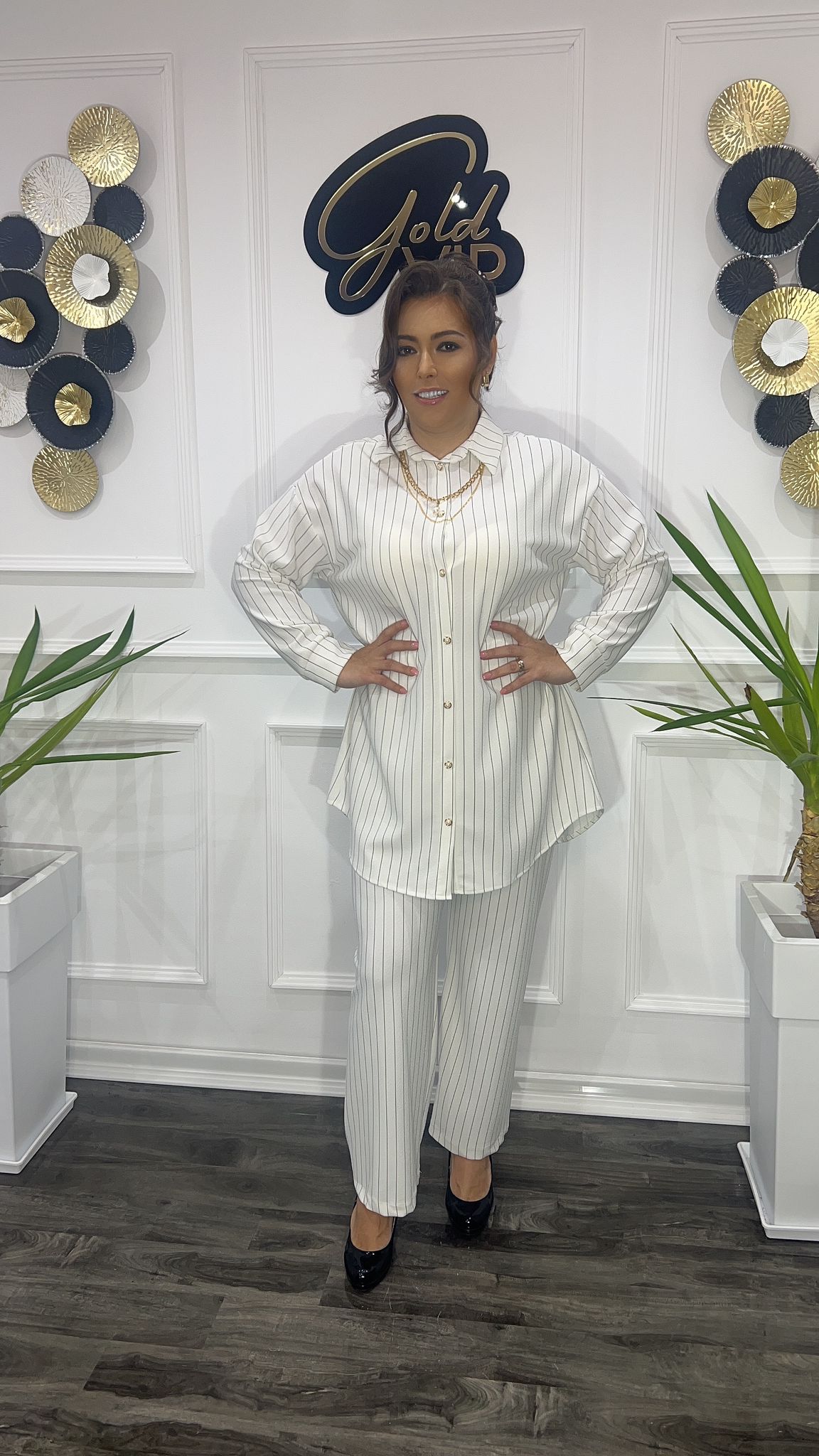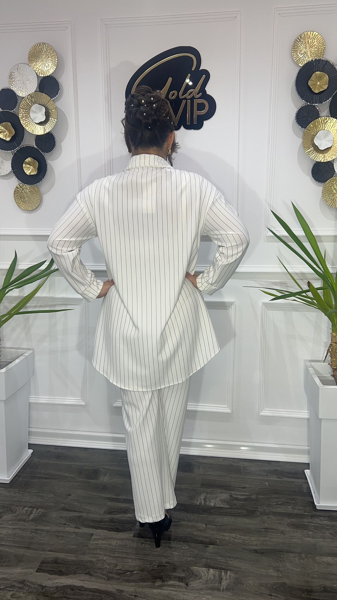 Acest compleu elegant cu dungi fine verticale este perfect pentru femeile care doresc să îmbine stilul sofisticat cu confortul. Setul este compus dintr-o cămașă lungă, cu croială lejeră și închidere cu nasturi aurii, oferind un aer rafinat și modern. Cămașa se distinge prin designul său asimetric, fiind ușor mai lungă în partea din spate, ceea ce adaugă un plus de originalitate ținută. Pantalonii cu talie înaltă și croială dreaptă completează armoniile acest look, oferind libertate de mișcare și un aspect structurat.